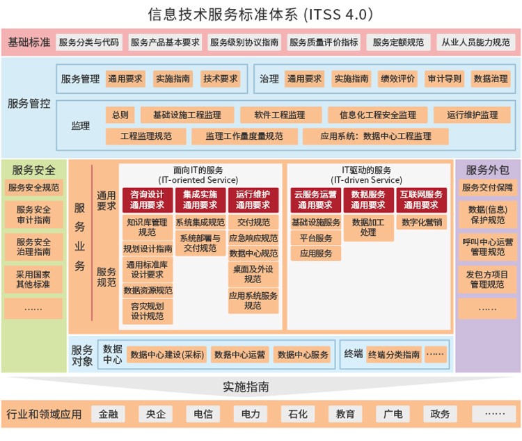 ITSS(Information Technology Service Standards 信息技术服务标准,简称 ITSS)是国内第一套成体系和综合 配套的信息技术服务标准库,全面规范了 IT 服务产品及其组 成要素,用于指导实施标准化和可信赖的 IT 服务。